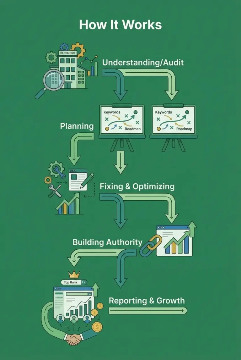 We get to work. We fix technical issues, improve your site speed, and update your content so that search engines like Google can easily find and rank you.